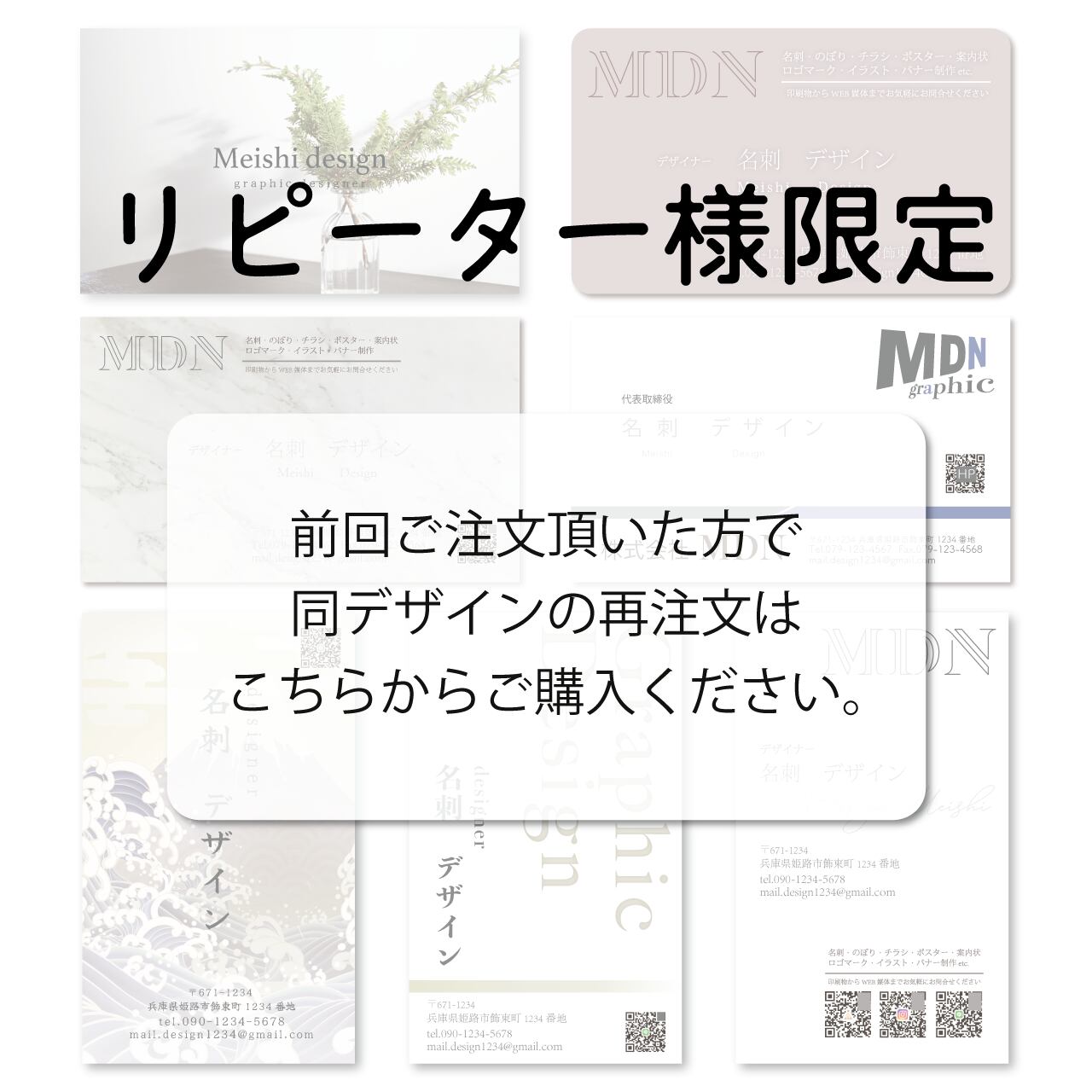 いつもご愛顧いただき、ありがとうございます。こちらは、同じデータでの名刺の印刷再注文専用の商品です。すでにご利用いただいた名刺デザインをそのまま再注文できるので、手間なく迅速にお届けいたします。